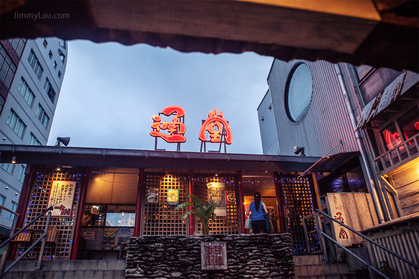 | 小祿站正前方是知名百貨公司,拉麵店就位處於它的前方斜角位置,琉球銀行隔壁,加上門前有個超大的招牌,不難發現。於傍晚時分,通堂大招牌還會發亮。 |