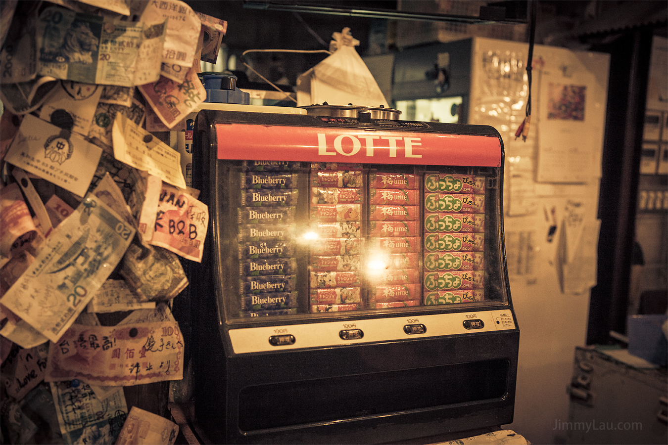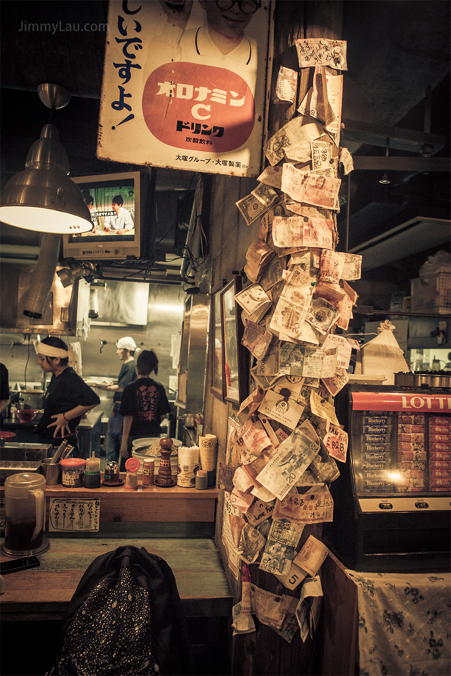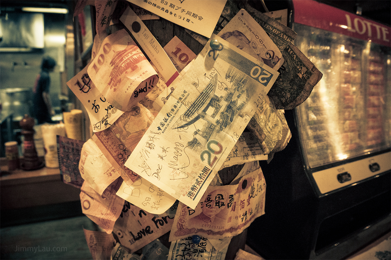 | 最吸睛的是這條如假包換的「金錢柱」,包含世界各地的真鈔票呢!上面全都寫上了文字,估計都是些讚美的話。從密密麻麻的紙幣堆,不難想像這裡的受歡迎程度! |