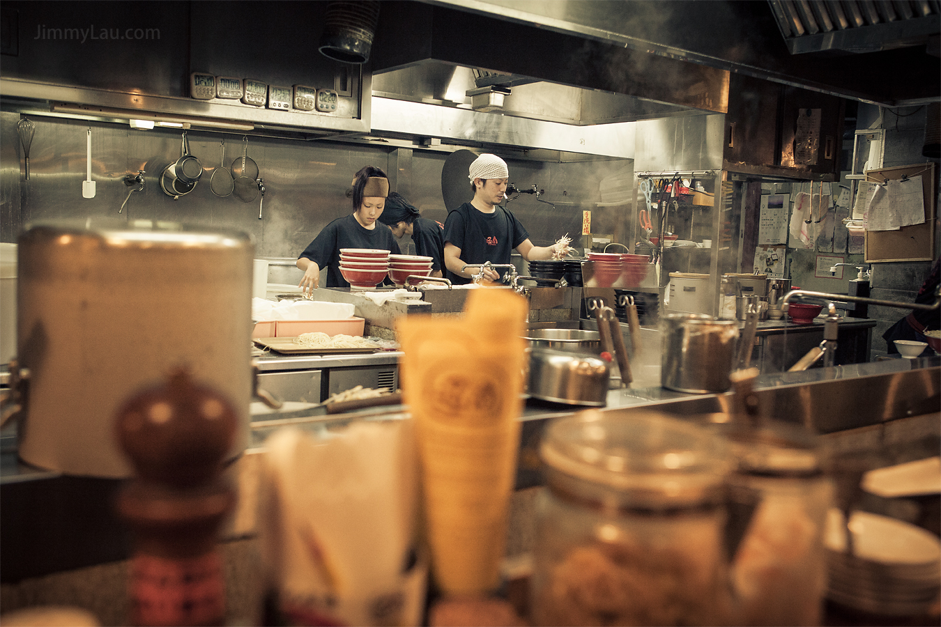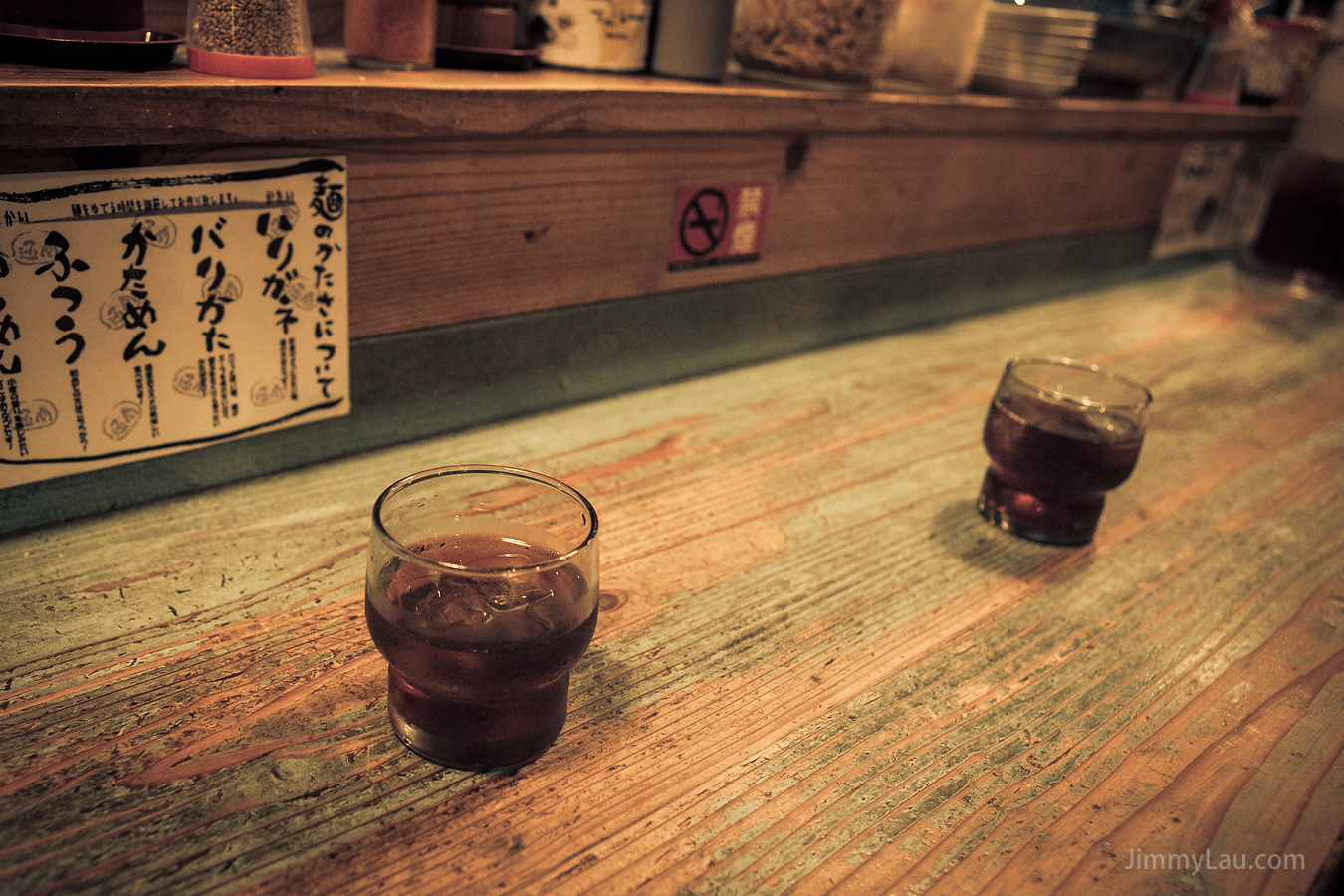 | 座位上,早就擺放好拉麵店的傳統「冰茶」。 購買食卷後,我們被安排坐在最接近廚房重地的吧枱位置,可以零距離地欣賞師傅的功架,連透明玻璃也沒有! 喜歡攝影的我又怎會乖乖坐下來等食呢!一場來到,當然要四處參觀。原來售票機後方還有一些包廂的座位,但都被食客佔據了,所以不便打擾。 |