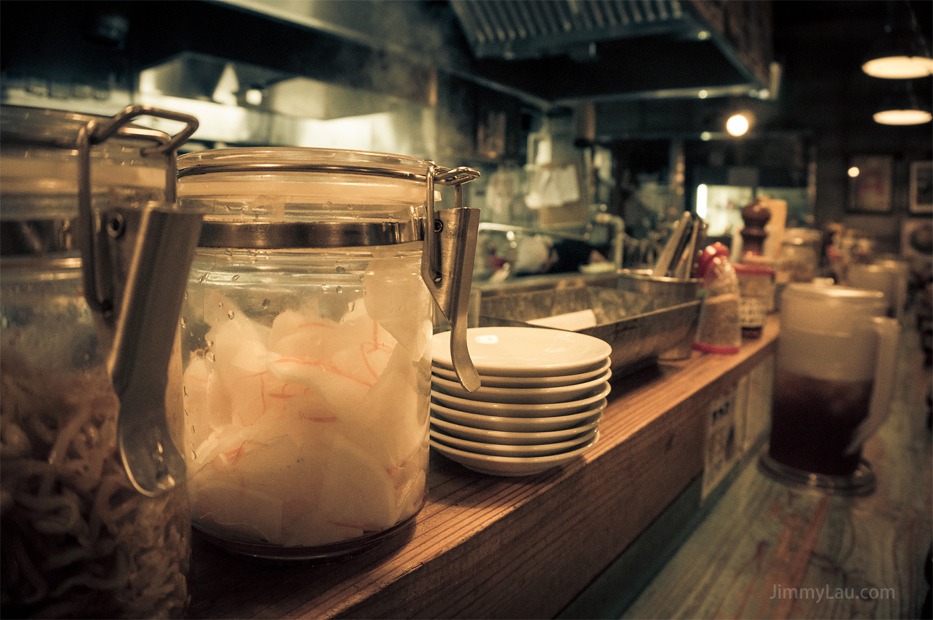 | 在吧枱上,配備了冰茶及漬物,供客人自取。而漬物更是存放在真空瓶內,方便衛生。漬物中有「豆芽」及「蘿蔔」。 |