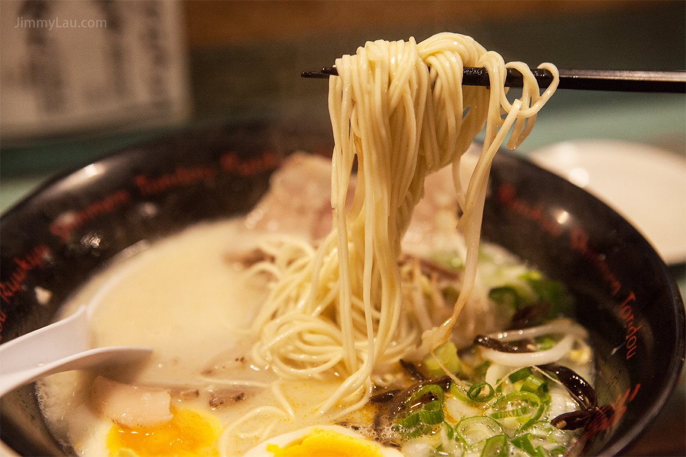 首先登場是朋友的「男人麵」,豬骨濃湯味的湯頭,數片的叉燒,破開了的味玉(溏心蛋),青嫩的蔥花,少許的木耳絲及豆芽。 |